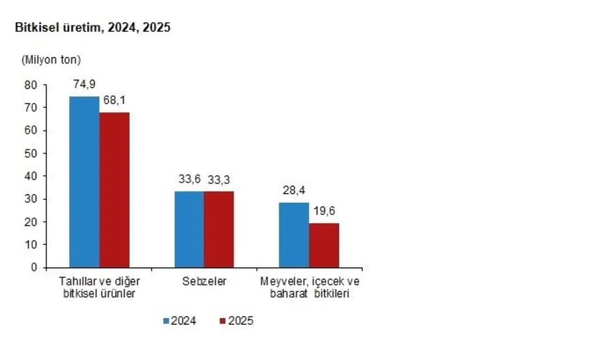 TÜİK, 2025 yılında bitkisel üretimlerin tahıllarda %9, sebzelerde %0.9, meyvelerde %30.9 azalacağını açıkladı.